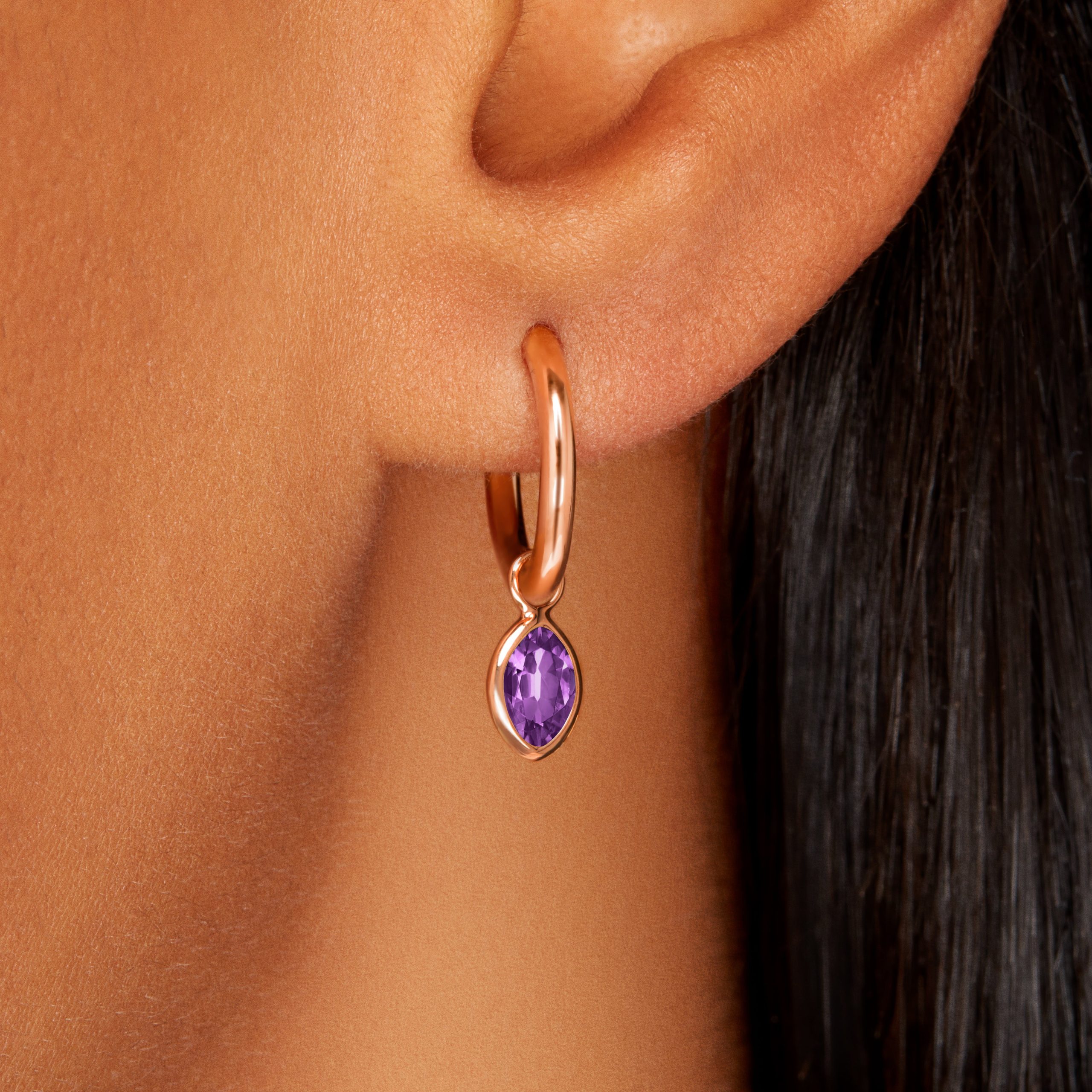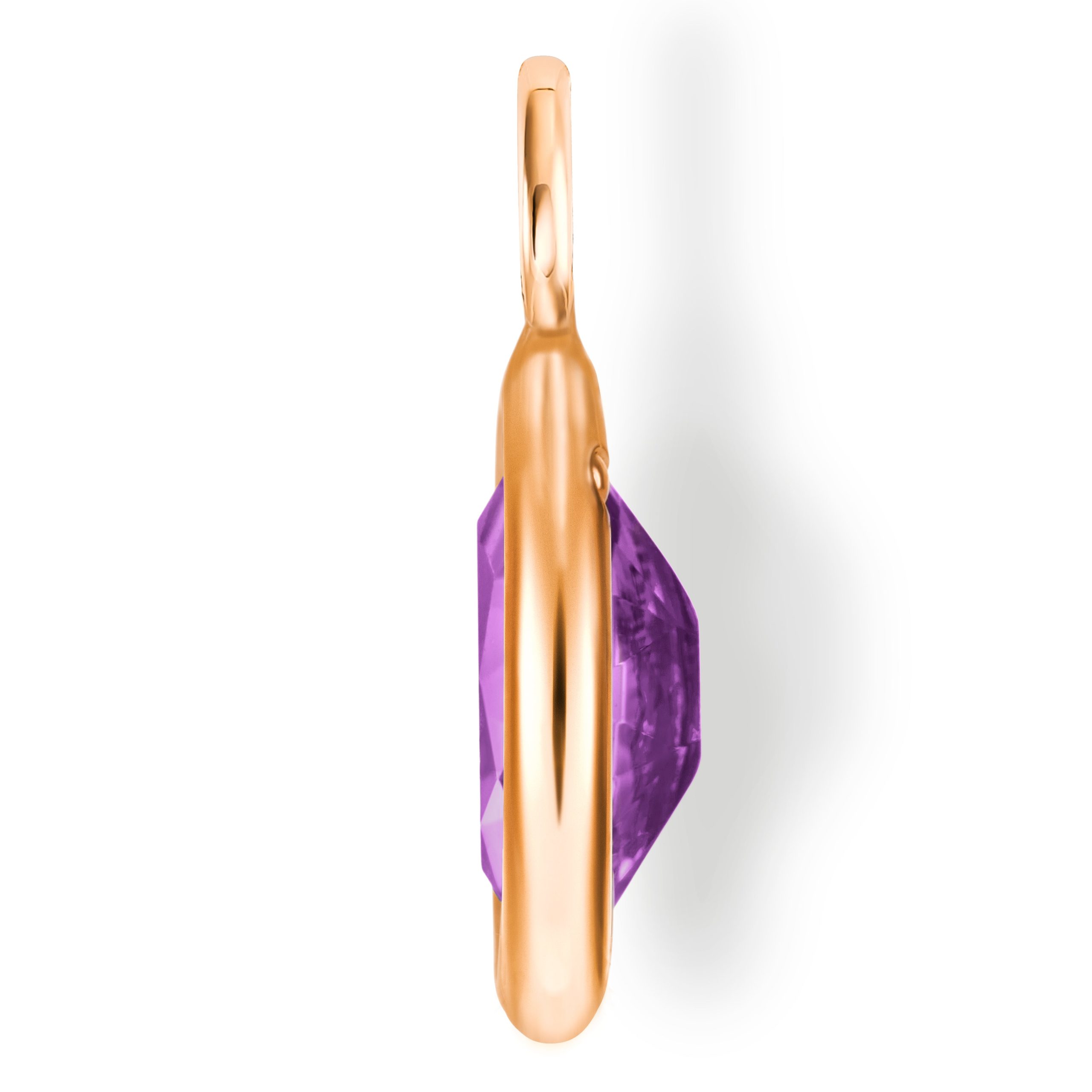 A stunningly radiant purple amethyst. This stone is an extraordinary violet variety of quartz in a striking cardinal purple hue. The charm is set with a beautiful vintage inspired moval cut stone which is a mixture of a pointed marquise and?a faceted oval. cut using traditional techniques to Lisa’s precise specifications.?Measuring 6mm x 4mm and set in a unique 18 carat rose gold open setting to reflect and refract the light and colour of the stone. This charm is approximately 1.13 carats in weight. The charm will arrive in a high quality. sealed and monogrammed white card envelope.