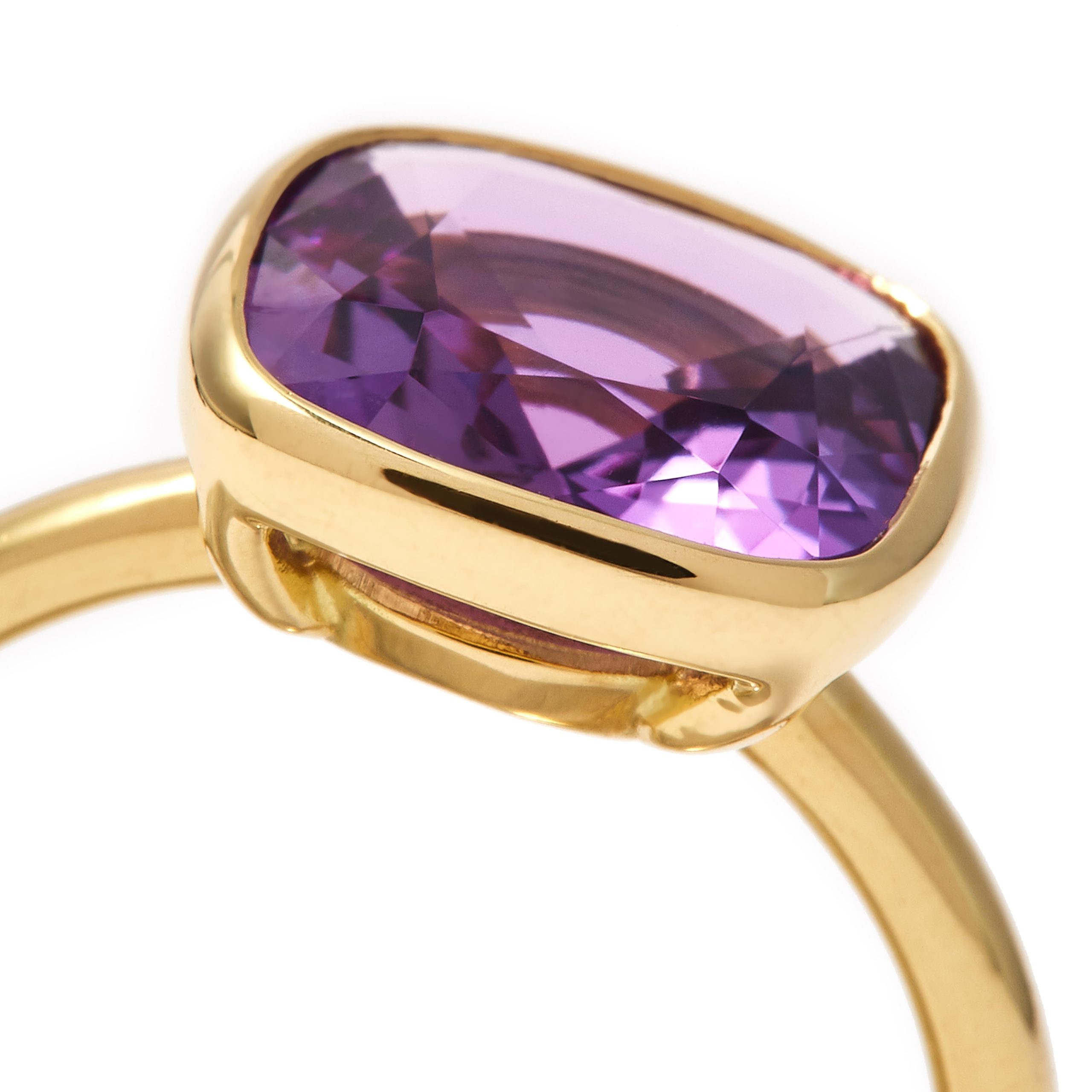 A stunningly radiant purple amethyst. This stone is an extraordinary violet variety of quartz in a striking cardinal purple hue. Its cushion cut measuring 10mm x 10mm brings out its unique tones and natural variations. Set in 18 carat gold with an open back to reflect and refract the light. The stone is approximately 3.10 carats in weight.