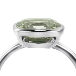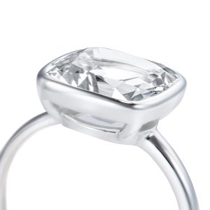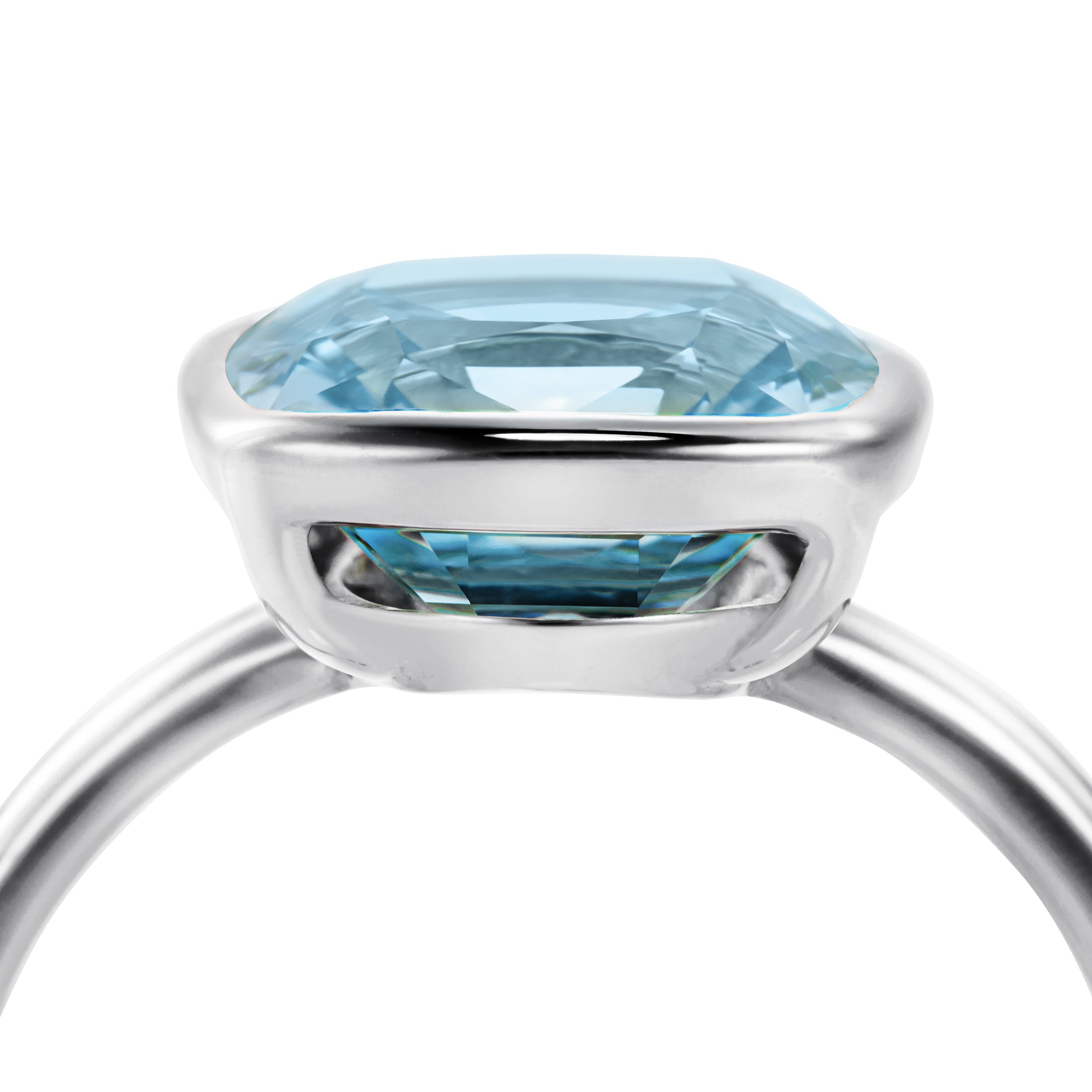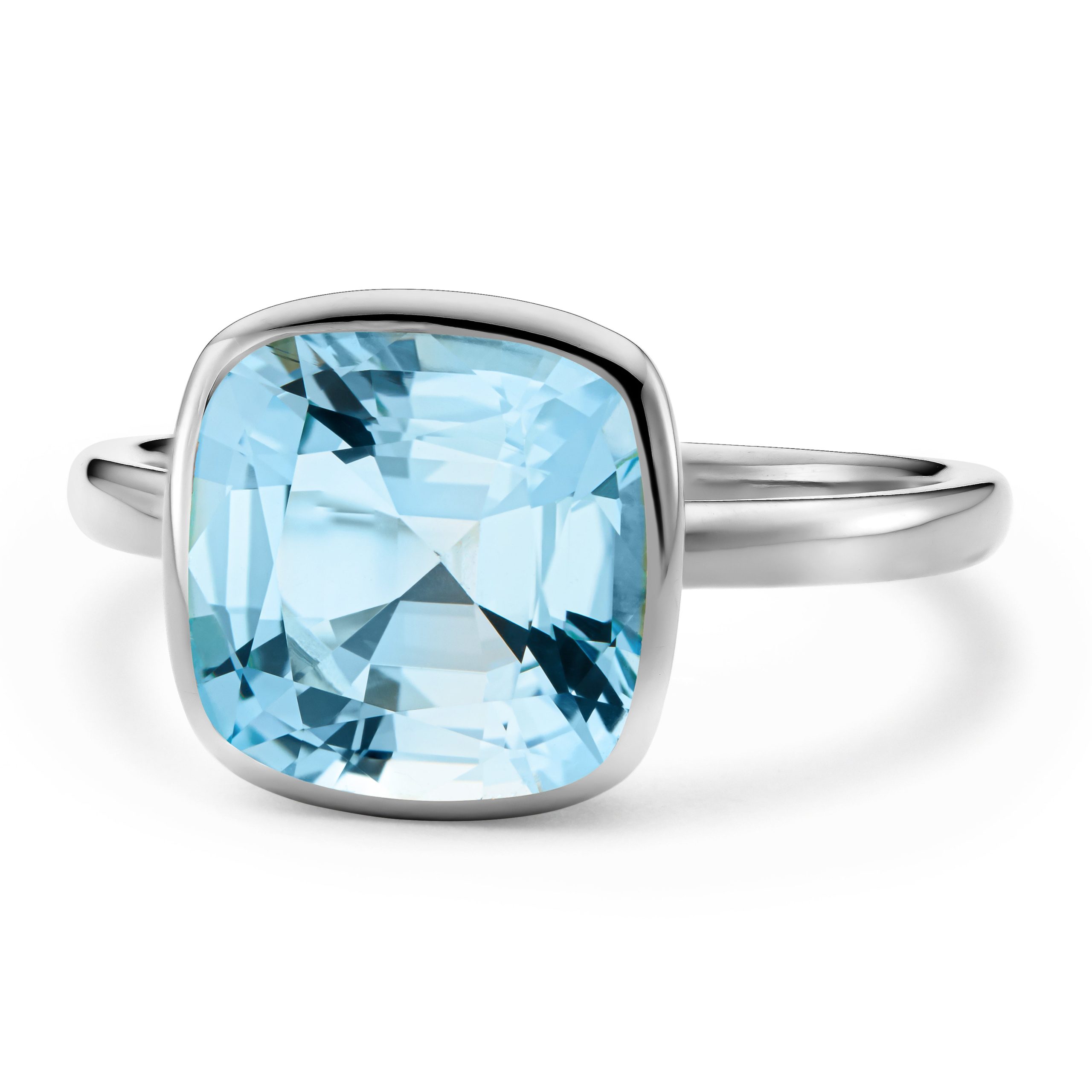A sparklingly clear sky blue topaz. Its cushion cut measuring 10mm x 10mm helps to perfectly accentuate its vibrant colour and enhances the clarity of the stone. Set in 18 carat white gold with an open back to reflect and refract the light. The stone is approximately 4.20 carats in weight.