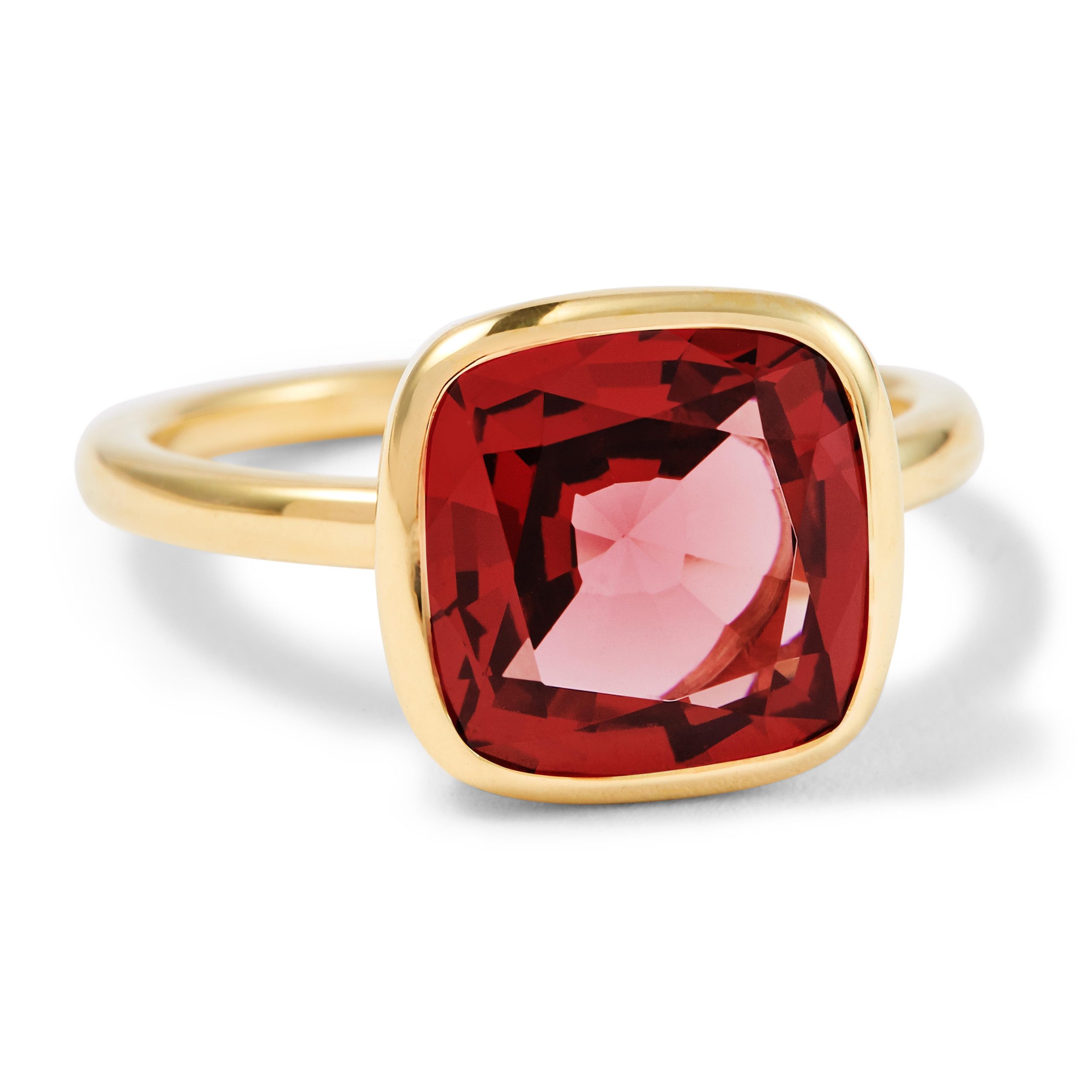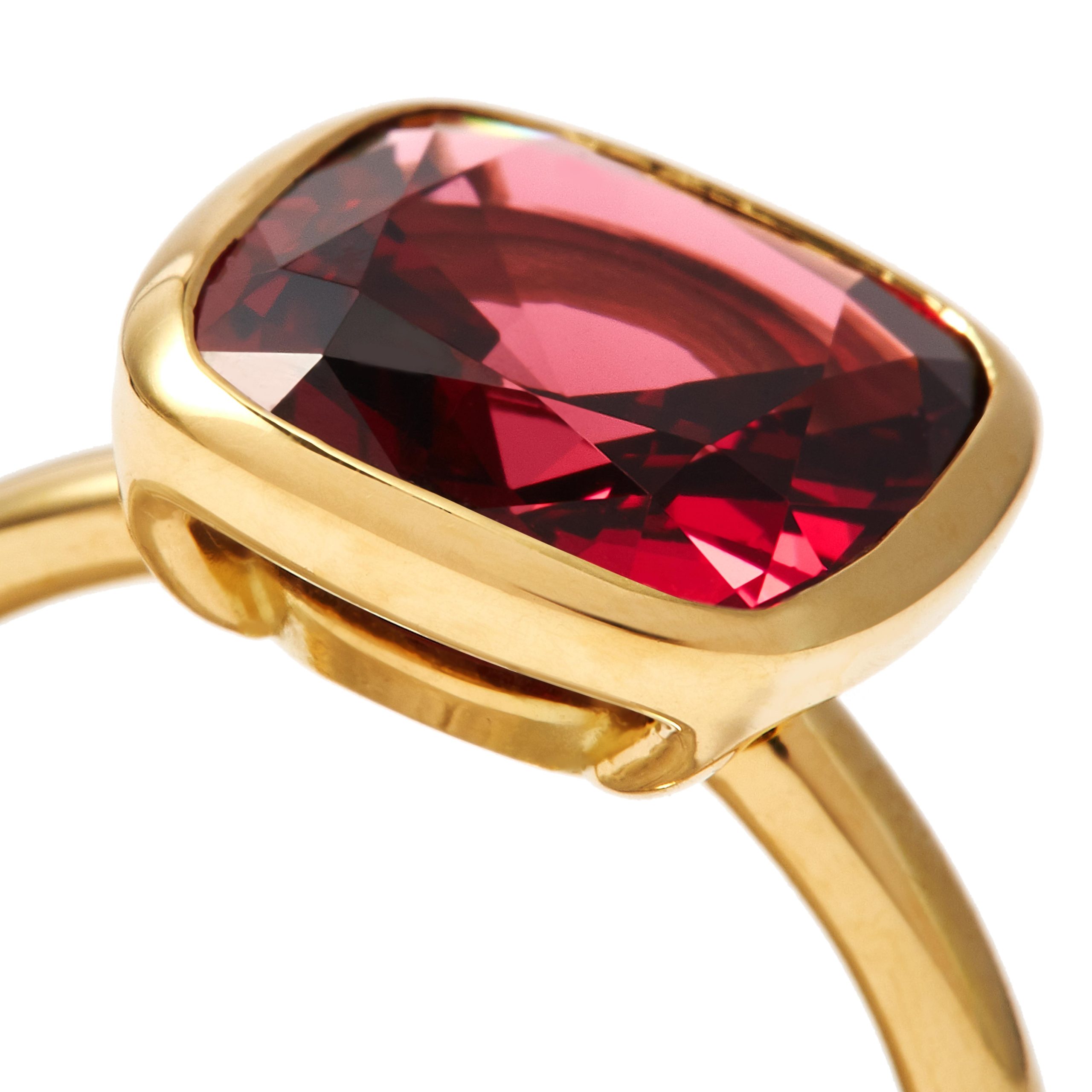 An intense berry red rhodolite garnet. This stone is part of the garnet family and derives its name from ‘granatus’ the latin name for pomegranate with a sensuous burgundy colour. Its cushion cut measuring 10mm x 10mm brings out its unique tones and natural variations. Set in 18 carat gold with an open back to reflect and refract the light. The stone is approximately 4.50 carats in weight.