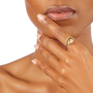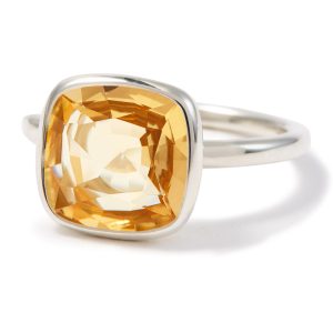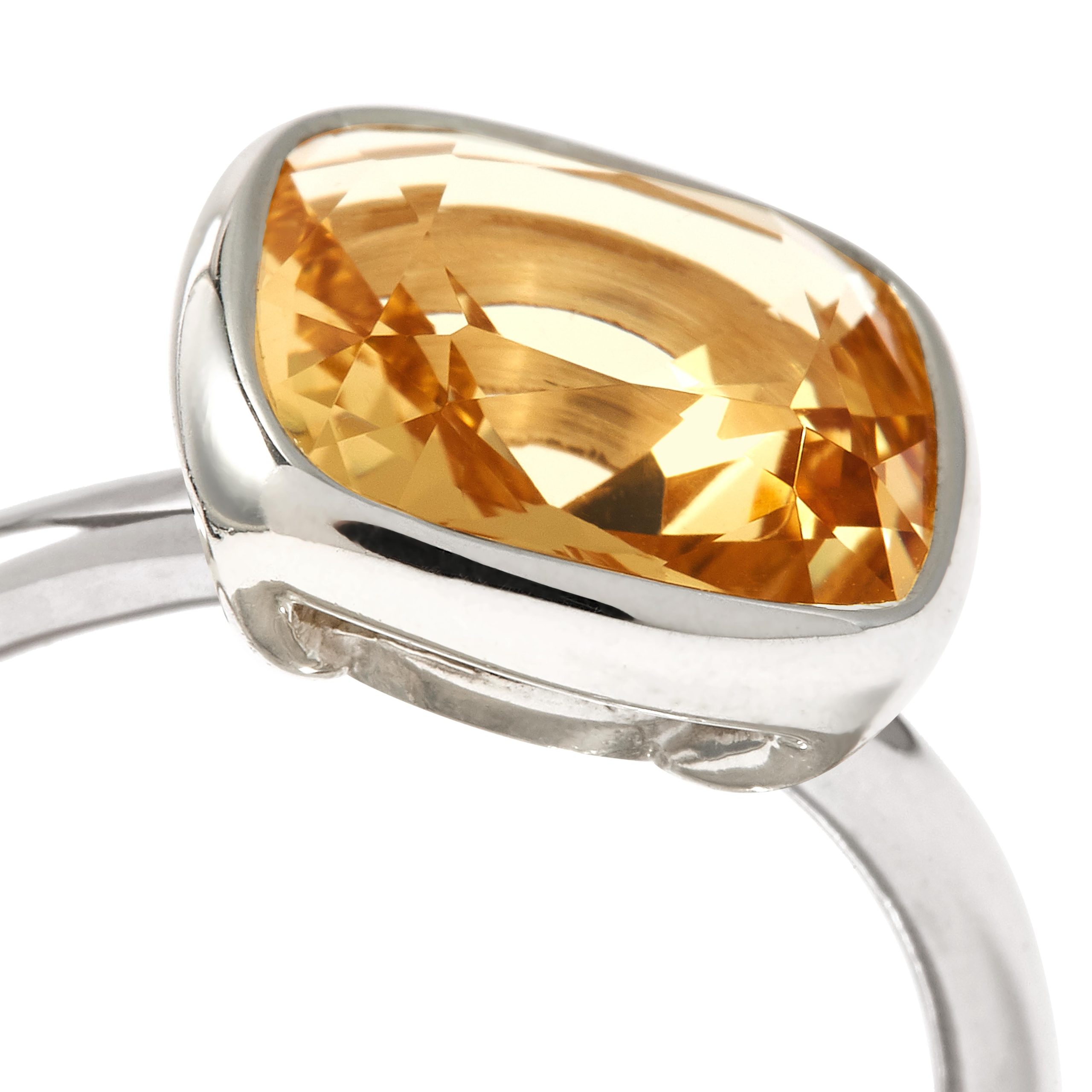 A beautifully subtle yellow citrine. This stone is a unique yellow variety of quartz in a delicate. warm sunlight shade. Its cushion cut measuring 10mm x 10mm brings out its unique tones and natural variations. Set in sterling silver with an open back to reflect and refract the light. The stone is approximately 3.10 carats in weight.