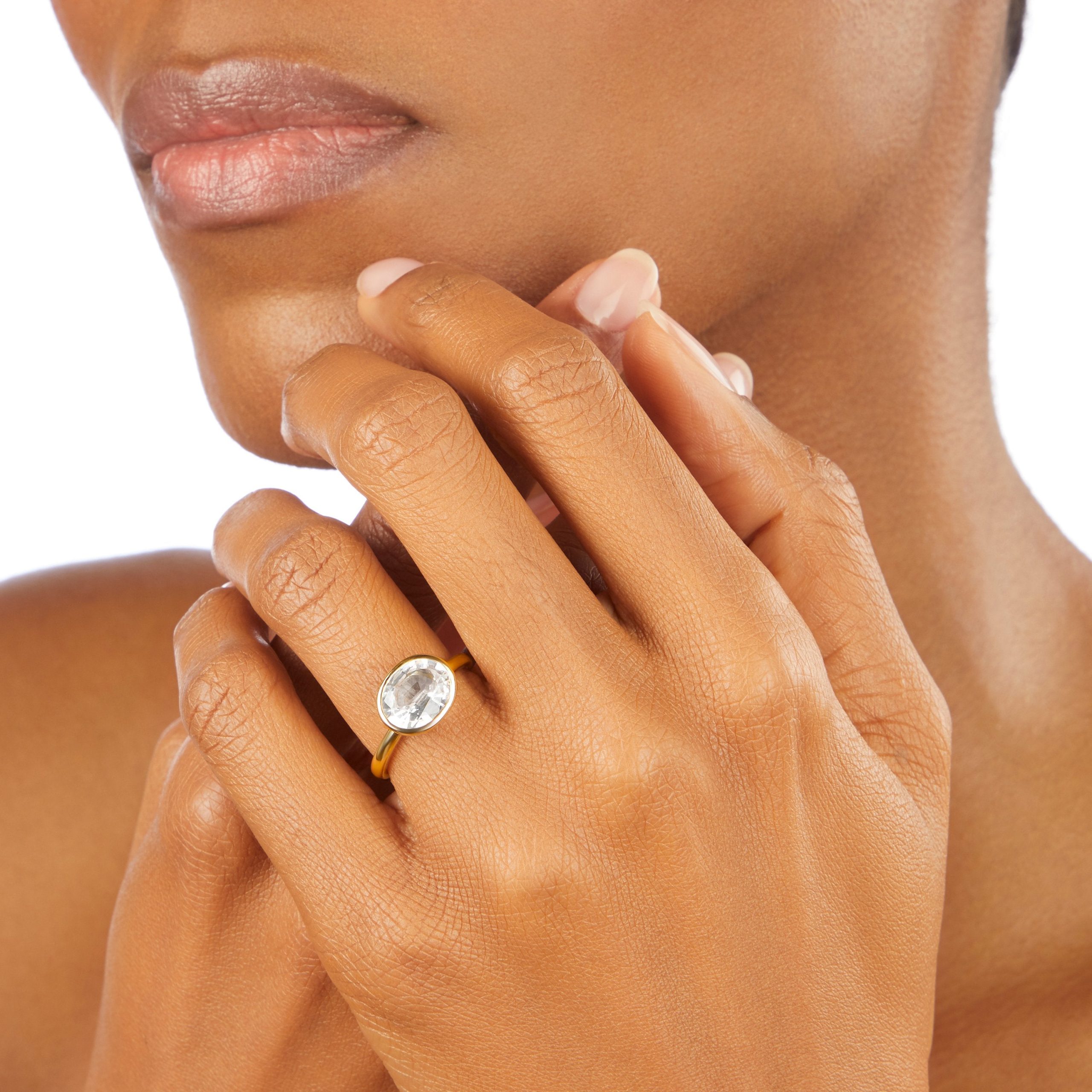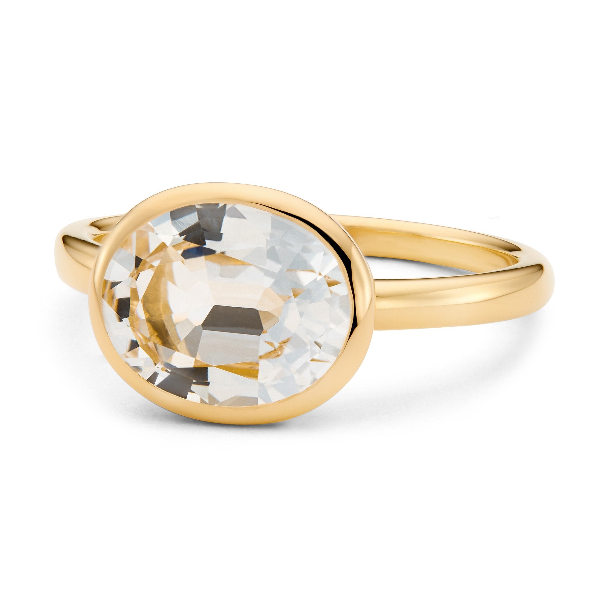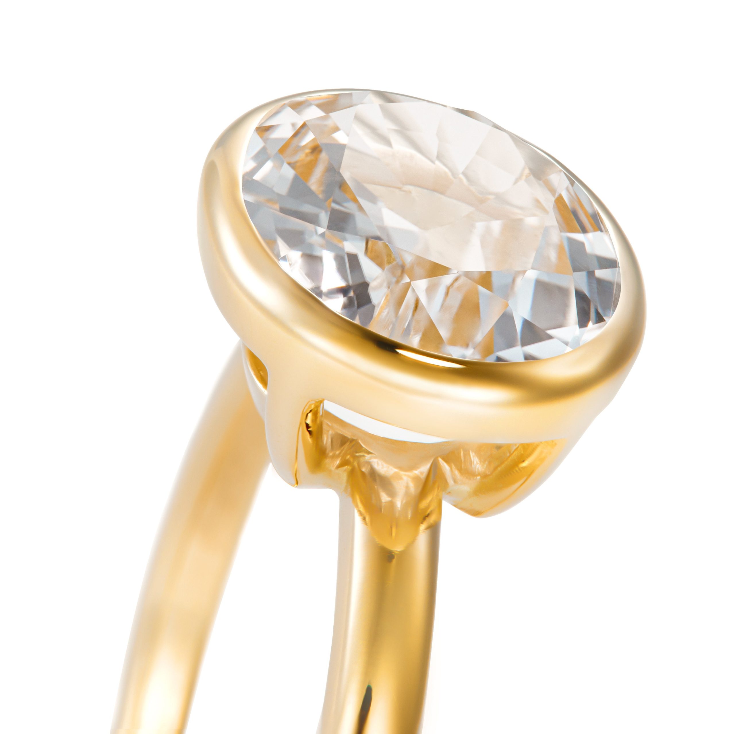 A natural white topaz with a clear colourless transparency making it the purest of the topaz family. The crystal clear simplicity compliments all skin tones. outfits and occasions. Its oval cut measuring 10mm x 8mm brings out its high lustre and natural variations. Set in 18 carat gold with an open back to reflect and refract the light. The stone is approximately 2.50 carats in weight.
